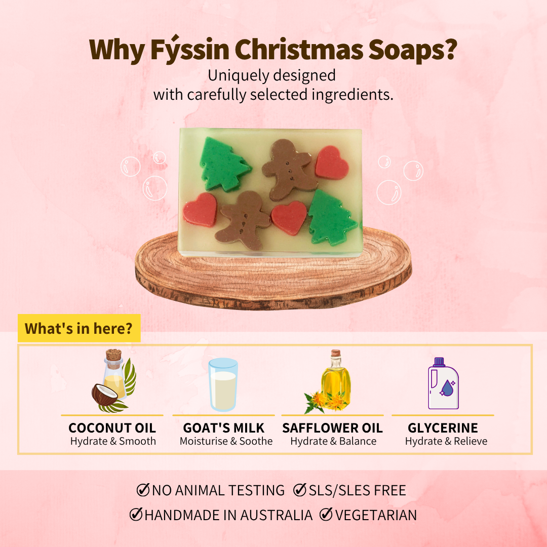 š Fýssin Christmas Special SoapsĀ Treat yourself with special soaps, uniquely designed and handmade in our Sydney warehouse. Made with 10% real liquid goat's milk and coconut oil, all ingredientsĀ are carefully selected for your best experience.